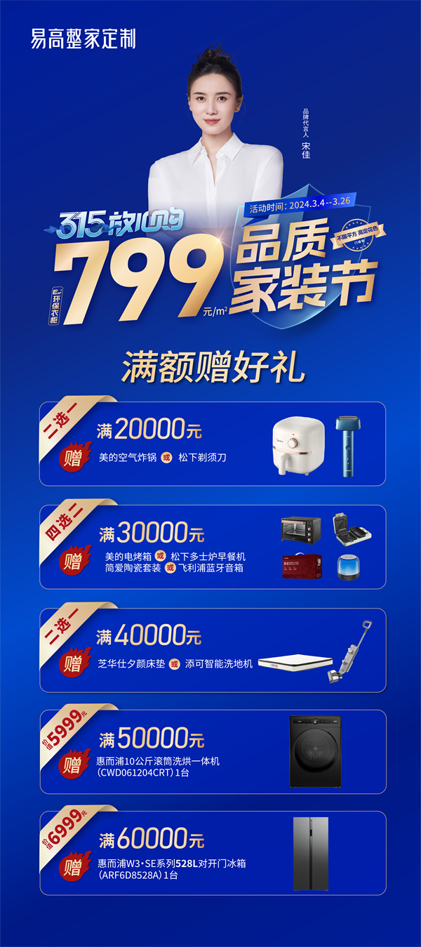 除了價(jià)格優(yōu)惠,易高整家定制還開(kāi)啟了“滿額贈(zèng)好禮”模式!3.15活動(dòng)期間,滿20000元送美的空氣炸鍋1臺(tái)/松下剃須刀;滿30000元送美的電烤箱/松下多士爐早餐機(jī)+簡(jiǎn)愛(ài)陶瓷套裝/飛利浦藍(lán)牙音箱;滿40000元送芝華仕床墊1張/添可智能洗地機(jī)...除此之外,還有很多超值福利哦!
