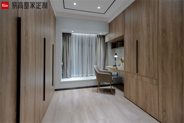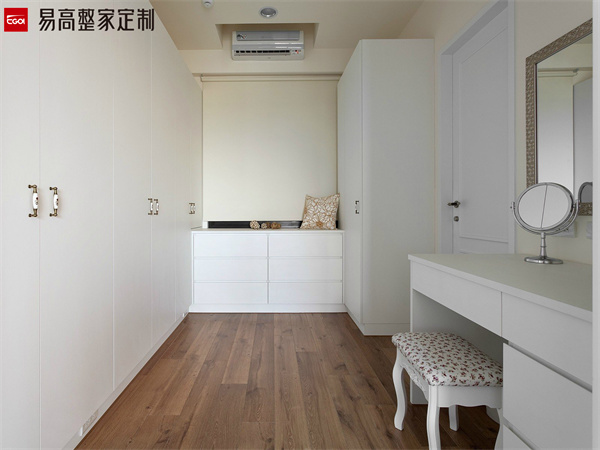 超大的L型衣帽間設(shè)計,具有強大的儲物功能與實用性,與梳妝臺一體化的設(shè)計,讓梳妝穿搭一并搞定,從細節(jié)處提升幸福感。簡約的線條、考究的比例,以及井然有序的設(shè)計感,讓空間更加整潔舒適,有種隱約的流動美感。家裝的個人品味也滲透在細節(jié)之處,整個衣帽間通透性設(shè)計,更顯時尚感。