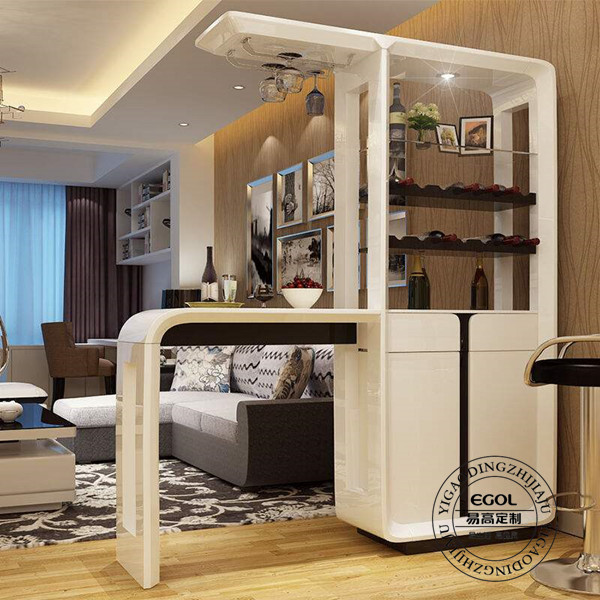如果客餐廳面積較大,可以嘗試使用吧臺式酒柜,這種設(shè)計比較符合現(xiàn)代家庭,三五好友相聚吧臺品酒,或是家中隨意做份小甜點于吧臺也是很方便的。如果普通面積的房型可以選擇隔斷式酒柜或是靠墻酒柜,選擇靠墻酒柜的話是比較有利于酒柜設(shè)計和擴充其儲物能力的。