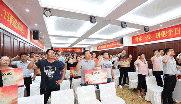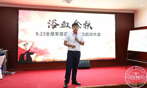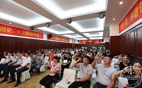 “燃戰(zhàn)心,凝熱血,全力以赴奮戰(zhàn)9.23”。40戶參與此次工廠行的加盟商代表及公司銷售精英近200人在易高家居合肥總部參加了誓師大會啟動儀式。
