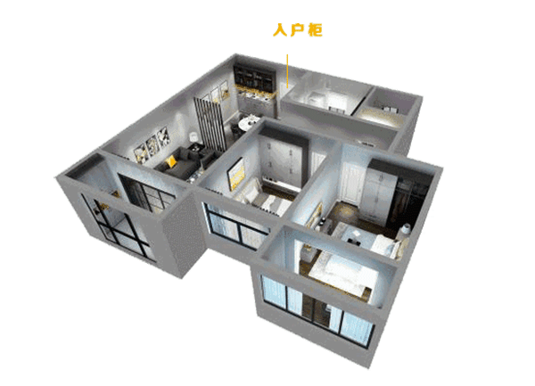 此戶型包含2個臥室柜,1個入戶柜,餐廳酒柜、客廳電視柜、陽臺柜,更有廚房3平方米的地柜+1平方米的吊柜家具,柜體總面積約22平方米。此外,還可享受一體化設計、裝修全流程服務,讓有裝修需求的家庭享受到質高價優(yōu)的全屋定制服務。
