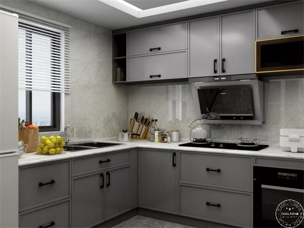 廚房要方便做飯,有足夠的空間放置物品。設計的關鍵在于利用空間定制操作臺面,打造吊柜。