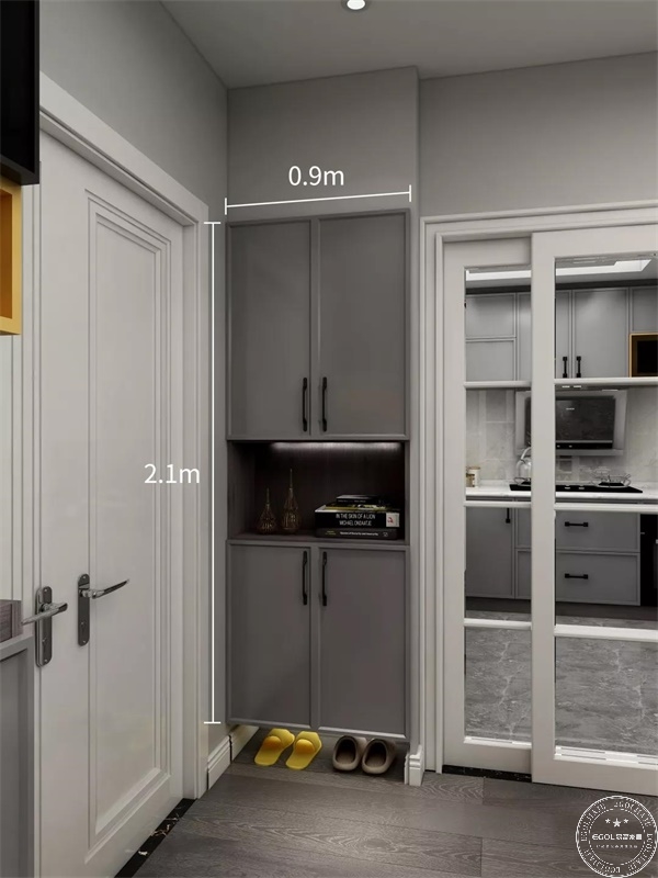 下方是鞋柜,中間是鏤空的展示區(qū)。展示區(qū)是主人表現個性的天地,可以根據自己的愛好、情調來打造,同時也為客廳增添了一道獨特的風景線。