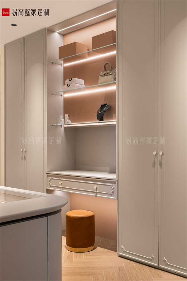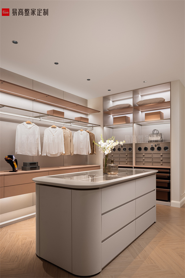 設(shè)計(jì)師巧妙運(yùn)用直線和曲線的交匯,創(chuàng)造出剛?cè)岵?jì)的大氣美感。開放式衣帽間系統(tǒng)和升降梳妝臺藏露有序,將空間層次層層推進(jìn)。流動的步履中,舉手投足間都縈繞著奢雅、隨性的氣息,舒享品質(zhì)人居。