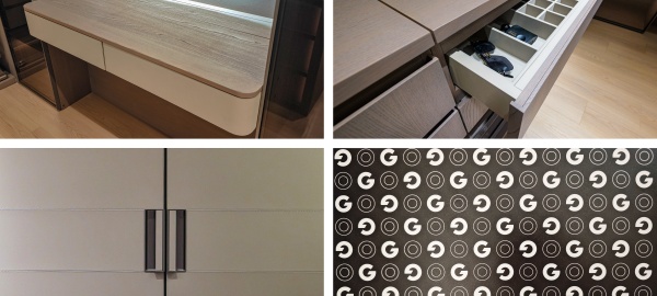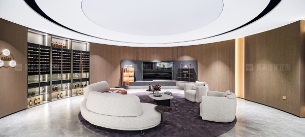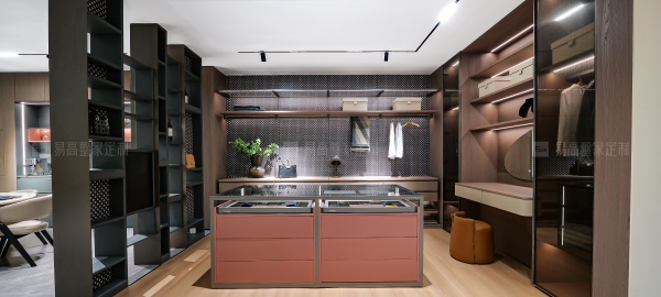 開放式壁掛系統(tǒng)與個性logo背板形成較大的視覺沖擊力,呈現(xiàn)獨一無二的奢雅質(zhì)感。玻璃、皮質(zhì)、金屬元素融合柔光氛圍,每個角落都散發(fā)慵懶高級感。