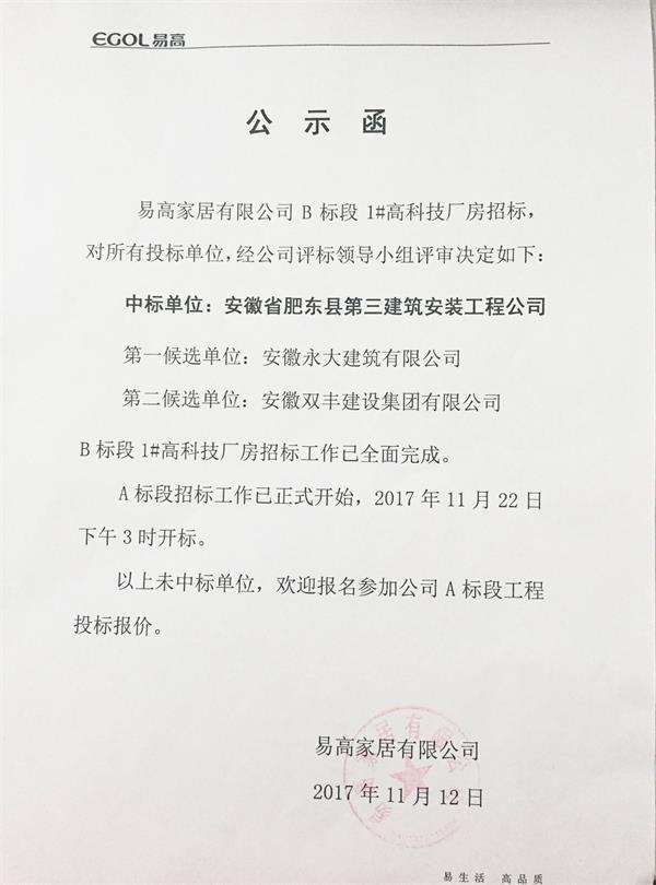 易高家居有限公司B標(biāo)段1#高科技廠房招標(biāo),對(duì)所有投標(biāo)單位,經(jīng)公司評(píng)標(biāo)領(lǐng)導(dǎo)小組評(píng)審決定如下: